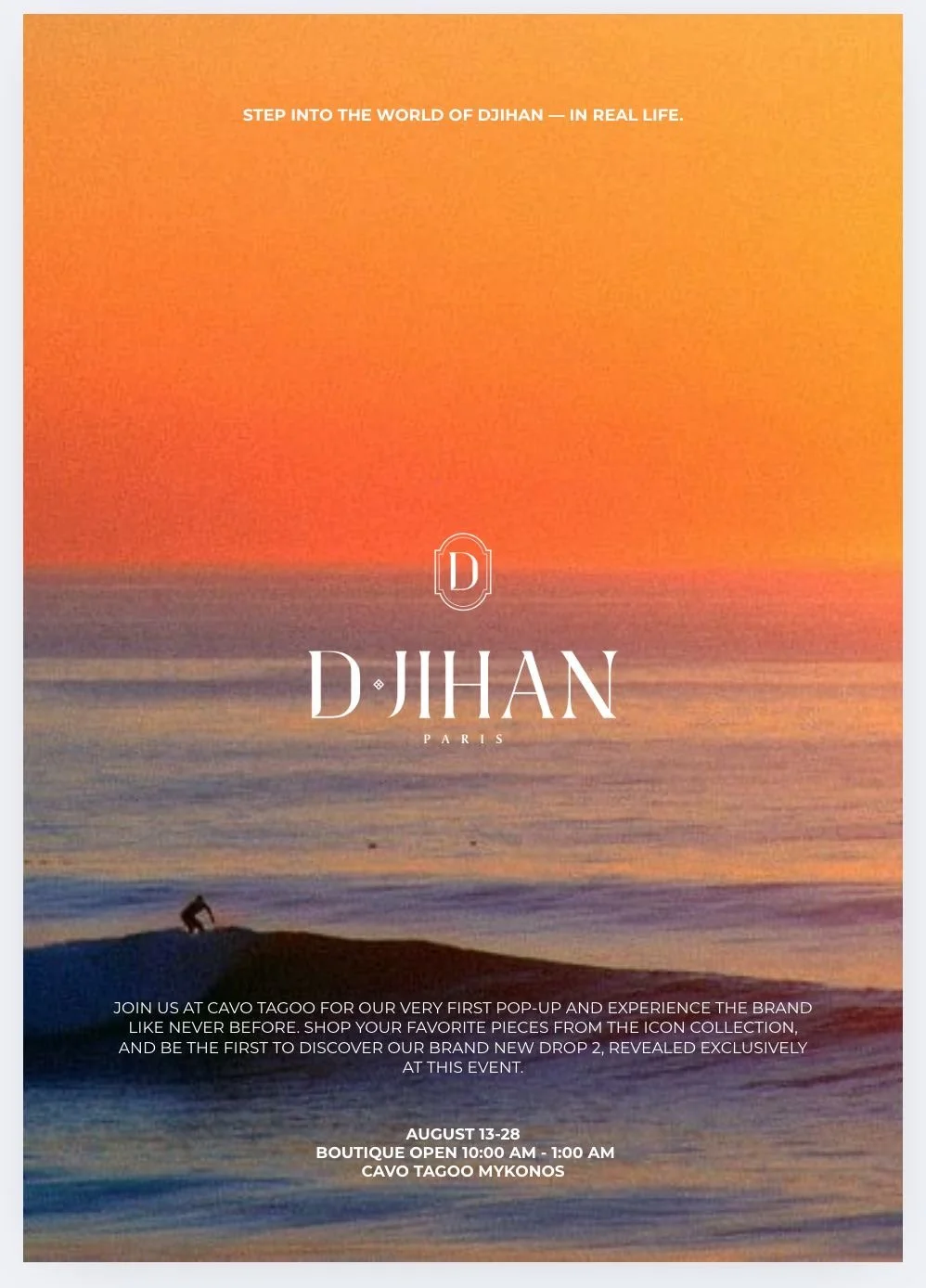 This magazine introduces Djihan Jewelry, a brand founded in 2005 by Jihan Alama, now run as a mother-and-son partnership with Louai Alama. The brand focuses on limited-quantity "drops" to maintain rarity and artistry. The magazine itself is a keepsake for "Cube Mirage Drop I" and announces the upcoming "Drop II."Djihan's signature collection, "Cube Mirage Drop I," features designs based on the symbolism of a cube, representing balance and strength. The pieces are crafted in 18k gold (yellow, white, and rose) and often adorned with ethically sourced diamonds, ranging from mini-cube necklaces to mega cube bracelets. These pieces are designed to be timeless heirlooms.